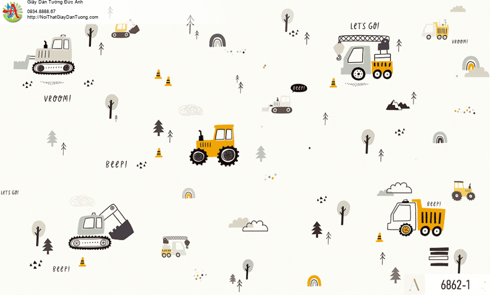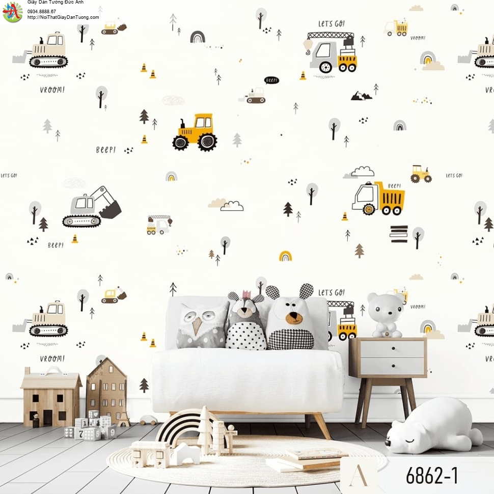 Giấy dán tường trẻ em, họa tiết ô tô tải máy cày máy xúc múc máy ủi - Albany 6862-1